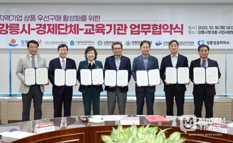 미담타임스 정인화 기자 | 강릉시는 16일 오후 2시 시청 8층 시민사랑방에서 경제단체 및 교육기관과 함께 지역기업 판로 확대와 상생 기반 조성을 위한 ‘지역기업 상품 우선구매 업무협약식’을 개최했다.