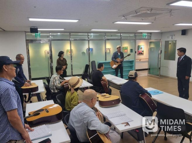 미담타임스 김교환 기자 | 고성군이 운영하는 고성군종합사회복지관 분관에서는 10월 17일 저녁, 야간노래교실과 통기타반 수강생들을 격려하기 위해 이상근 군수가 직접 현장을 방문했다.