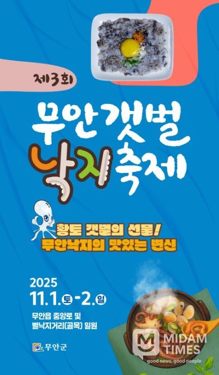 김산 군수는 “가을철 최고의 보양식이자 뻘밭의 산삼이라 불리는 무안 낙지를 비롯해, ‘집 나간 며느리도 돌아온다’는 전어와 제철 새우 등 풍성한 별미가 준비돼 있다”며, “이번 축제가 무안의 맛과 멋을 느끼는 특별한 시간이 되길 바란다”고 전했다.