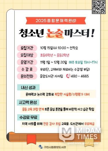 미담타임스 김준완 기자 | 구미시립중앙도서관은 청소년들의 기초 문해력과 논리적 사고력 향상을 위해 마련한 논술특별프로그램 ‘청소년 논술마스터’ 수강생을 시립중앙도서관 누리집에서 선착순으로 모집하고 있다.