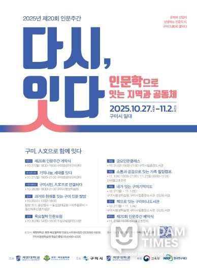 미담타임스 김준완 기자 | 구미시에서는 한국연구재단(교육부)과 구미시가 공동으로 지원하고 계명대학교 목요철학원이 주관하는 인문도시조성지원사업의 일환으로 오는 10월 27일부터 11월 2일까지 일주일간 제20회 인문주간을 운영한다.