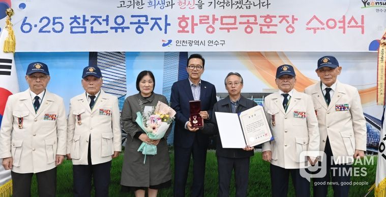 미담타임스 정주환 기자 | 연수구는 지난 21일 6·25전쟁에 참전해 공을 세운 故이장호 중사 유가족에게 화랑무공훈장과 증서를 전달했다.