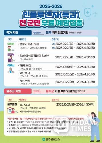 미담타임스 김준완 기자 | 울산 울주군이 오는 27일부터 전 군민을 대상으로 인플루엔자 무료 예방접종을 실시한다고 23일 밝혔다.