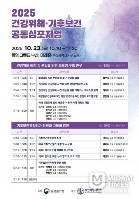 미담타임스 조혜리 기자 | 질병관리청은 10월 23일 대한예방의학회와 합동으로'건강위해‧기후보건 공동심포지엄'을 개최한다.