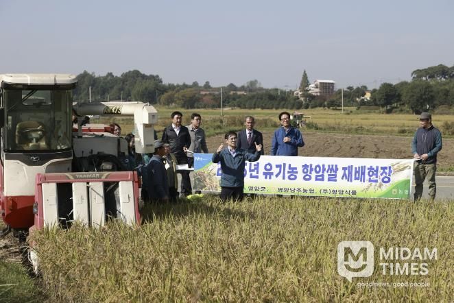 미담타임스 정인화 기자 | 영암군이 22일 벼 수확이 한창인 덕진면 노송리 친환경 기능성쌀 재배 현장에서 농업인의 의견을 들었다.