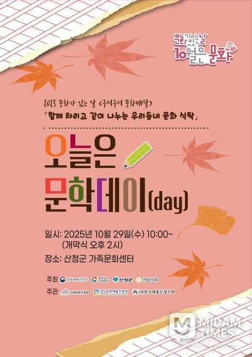 미담타임스 김교환 기자 | 산청군은 오는 29일 가족문화센터에서 ‘오늘은 문학데이(day)’를 운영한다고 24일 밝혔다.