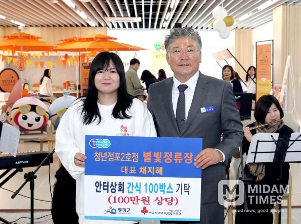 미담타임스 정인화 기자 | 영광군은 지난 27일 영광군 군서면에 위치한 청년점포 2호점 별빛정류장(대표 채지혜)에서 지역 어르신을 위해 ‘안터상회 간식 100박스’를 기탁했다고 밝혔다.