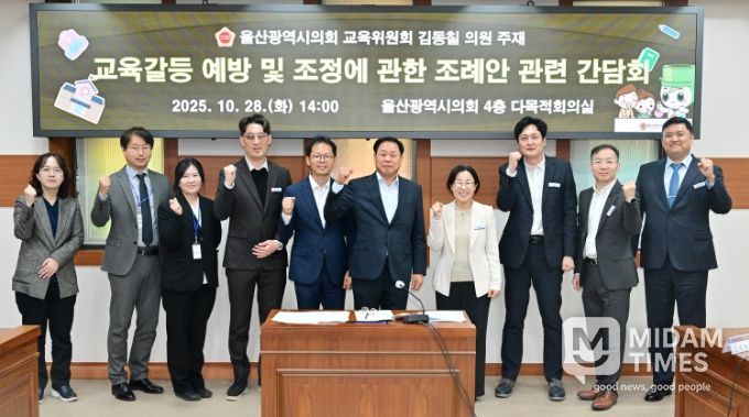 미담타임스 김준완 기자 | 울산광역시의회 김동칠 의원(교육위원회, 달동ㆍ수암동)은 10월 28일 오후, 시의회 4층 다목적회의실에서 ‘교육갈등 예방 및 조정에 관한 조례안’ 제정을 위한 간담회를 열고 교육 현장에서 발생하는 갈등의 예방 및 조정체계 구축 방안에 대해 논의했다.