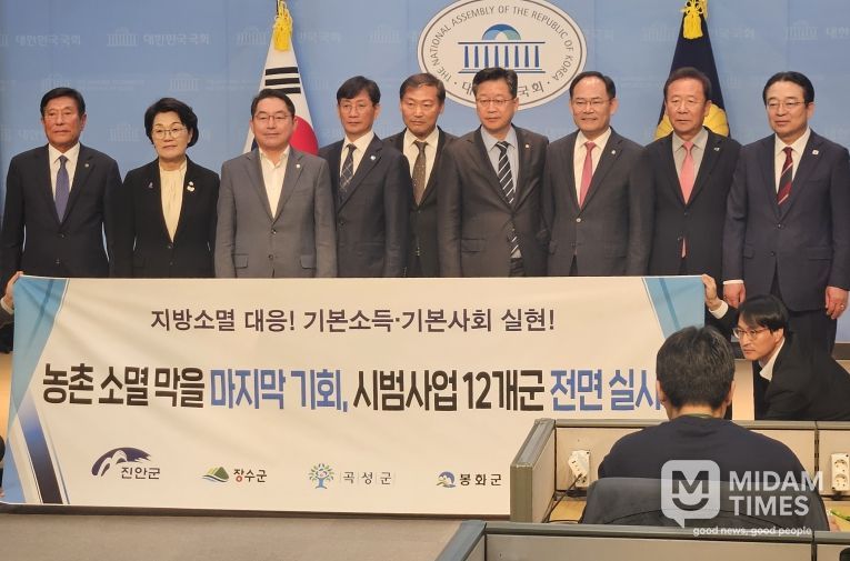 미담타임스 정인화 기자 | 정부가 추진 중인 농어촌 기본소득 시범사업과 관련해, 1차 심사를 통과하고도 최종 선정에서 제외된 곡성·진안·장수·봉화·옥천 5개 군이 10월 29일 오전 11시 국회 소통관에서 기자회견을 열고 “농어촌 기본소득 시범사업은 12개 군 모두에서 전면 시행돼야 한다”며 정부의 추가 예산 확보와 시범지역 확대를 강력히 촉구했다.