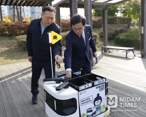 공원에는 자율주행 로봇 2대가 운영되고 있다. 오전 10시부터 오후 7시까지는 재활용품 수거를 돕고 오후 6시 30분부터 9시 30분까지는 야간 순찰활동을 한다.
