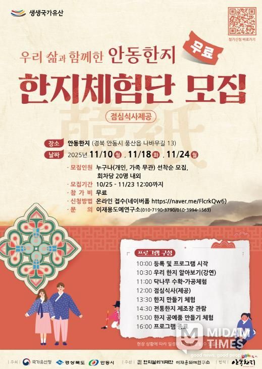 미담타임스 김준완 기자 | 재단법인 한지살리기재단이 주관하는 '우리 삶과 함께한 안동한지' 사업의 ‘한지체험단’ 참가자를 10월 29일부터 선착순으로 모집한다.