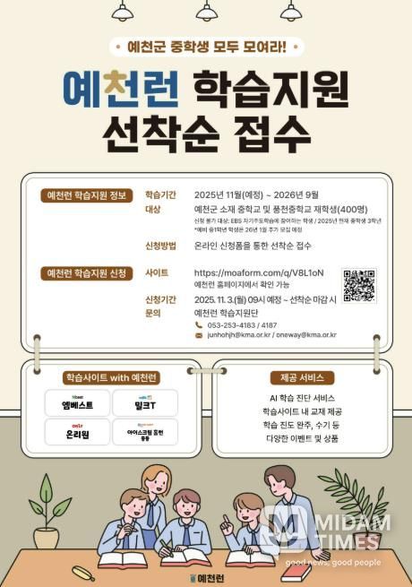 미담타임스 김준완 기자 | 예천군은 지역 청소년의 학습격차 해소와 자기주도학습 역량 강화를 위해 추진하는 AI 기반 학습지원 사업 ‘예천런’의 참여 학생을 오는 11월 3일부터 모집한다.