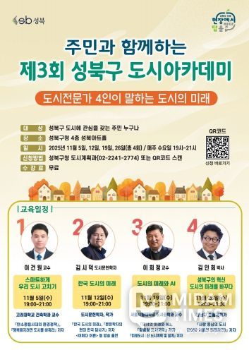 미담타임스 정주환 기자 | 서울 성북구가 우리나라를 대표하는 도시 전문가 4인을 초빙해 도시의 모든 것을 알려주는 ‘제3회 성북구 도시아카데미’를 진행한다.