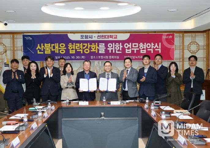 미담타임스 김준완 기자 | 포항시는 30일 시청 중회의실에서 선린대학교와 산불 감시·예방 전문인력 양성 및 드론 기반 산불 대응체계 구축을 위한 업무협약을 체결했다.