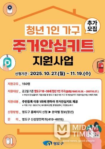 미담타임스 김교환 기자 | 부산 영도구는 지역 내 청년 1인 가구의 주거 안심도를 높이고 사회적 고립감을 해소하는 등 안전한 주거환경을 조성하고자 ‘청년 1인 가구 주거안심키트 지원사업’을 1차에 이어 2차로 추가 모집에 나선다.
