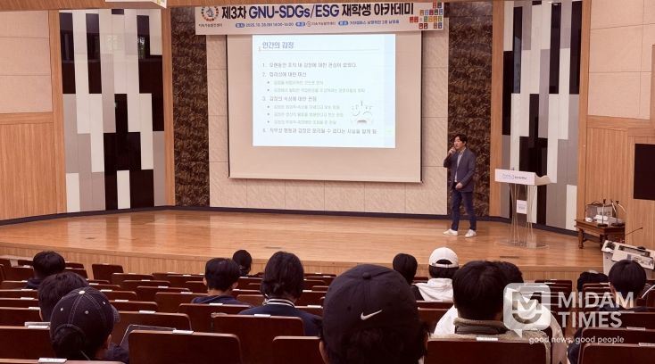 미담타임스 김교환 기자 | 경상국립대학교 지속가능발전센터(센터장 김영철 회계세무학부 교수)는 10월 28일 가좌캠퍼스 남명학관에서 ‘개인의 행복과 조직의 성공을 위한 지속가능한 리더십’이라는 주제로 ‘제3차 GNU-SDGs ESG 재학생 아카데미’를 개최했다.