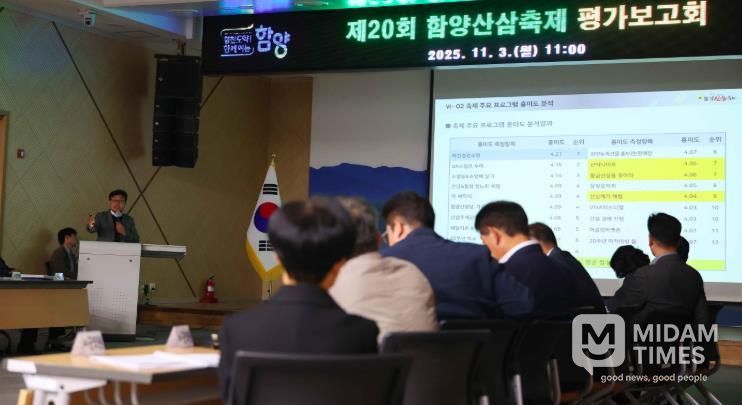 미담타임스 김교환 기자 | 함양군은 11월 3일 군청 대회의실에서 진병영 군수를 비롯한 이현재 산삼축제위원장, 축제 위원, 군의원, 부서장 등 70여 명이 참석한 가운데 ‘2025년 제20회 함양산삼축제 평가보고회’를 개최했다.