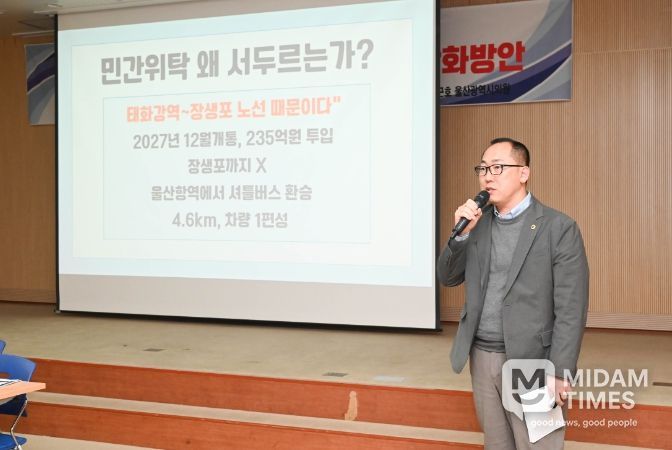 미담타임스 김준완 기자 | 울산광역시의회 손근호 의원(산업건설위원회)은 3일 오후 의회 3층 회의실에서 진보당과 시민연대와 공동으로 울산의 공공교통 전환 토론회를 개최했다.