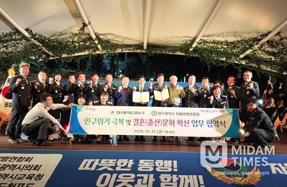 미담타임스 김교환 기자 | 대구 달서구는 지난 31일 대구광역시 자율방범연합회와 초저출생 인구위기 극복을 위해 공동 대응하고,‘잘 만나보세’뉴(NEW) 새마을운동(결혼문화) 확산 등을 위한 업무 협약을 체결했다.