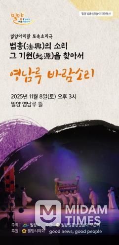 미담타임스 김교환 기자 | 경남 밀양시는 오는 8일 오후 3시 영남루 마당에서 밀양법흥상원놀이 토속소리극 ‘영남루 바람소리’ 공연을 선보인다고 5일 밝혔다.