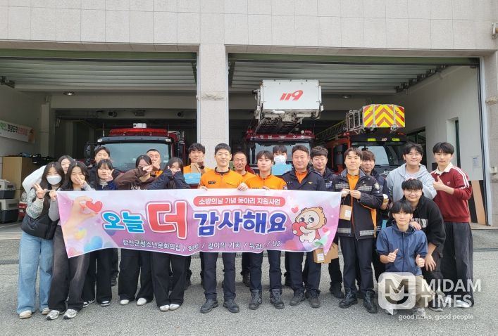 미담타임스 김교환 기자 | 합천군 청소년문화의집(센터장 김윤철)은 8일 청소년 봉사동아리(15명)와 함께 합천소방서를 방문하여 ‘오늘 더 감사해요’ 나눔을 실천했다.