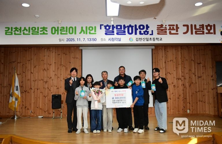 미담타임스 김준완 기자 | 김천복지재단(이사장 배낙호)은 지난 7일, 김천 신일초등학교(교장 채득원) 어린이 작가 22명으로부터 시집 『할말하않』 출판 수익금 성금 30만 원을 전달받았다고 밝혔다.