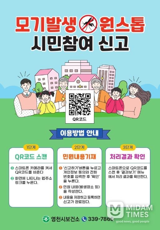 미담타임스 김준완 기자 | 영천시보건소는 QR코드를 활용한 ‘모기발생 원스톱 시민참여 신고’ 시스템을 시범 운영한다고 10일 밝혔다.