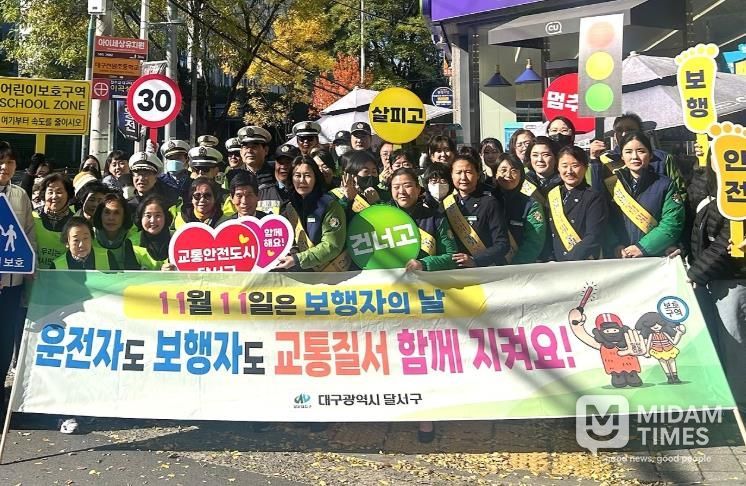 미담타임스 김교환 기자 | 대구 달서구는 ‘2025년 보행자의 날(11월 11일)’을 맞아 11월 10일 성서노인종합복지관 앞 삼거리(노인보호구역)에서 ‘보행안전 릴레이 캠페인(신호등 퍼포먼스)’을 개최했다.