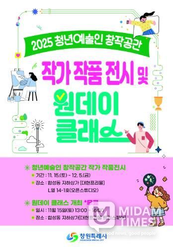 미담타임스 김교환 기자 | 창원특례시는 오는 11월 15일 합성동 지하상가(대현프리몰)에서 청년예술인 창작공간 입주 작가들의 성과 공유를 위한 작품 전시회와 시민과 함께 창작의 즐거움을 나누는 원데이클래스를 개최한다고 밝혔다.