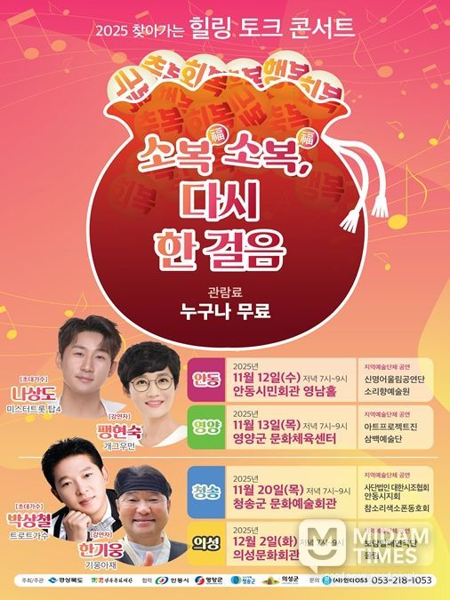 미담타임스 김준완 기자 | 경상북도와 경북문화재단은 상반기 대형 산불로 큰 피해를 본 안동, 영양, 청송, 의성 지역민을 위로하기 위한 치유형 문화예술행사 ‘찾아가는 힐링 토크 콘서트-소복소복, 다시 한 걸음’을 개최한다.