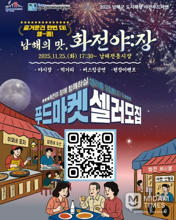 미담타임스 김교환 기자 | 남해군 도시재생지원센터는 지역 상권 활성화와 야간 관광문화 조성을 위해 ‘2025 남해군 도시재생 야간푸드마켓 화전야:장’에 참여할 셀러를 모집한다.
