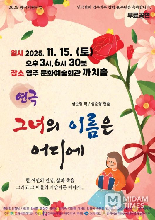 미담타임스 김준완 기자 | 지역의 이야기를 예술로 풀어낸 창작 연극 〈그녀의 이름은 어디에...〉가 오는 11월 15일 오후 3시와 6시 30분, 영주문화예술회관 까치홀 무대에서 관객을 만난다.