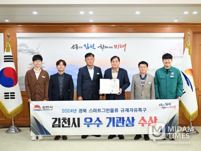 미담타임스 김준완 기자 | 김천시는 지난 11월 6일 대전에서 이틀간 열린 중기부 주최 '혁신특구 ON 2025' 행사에서 스마트그린물류 규제자유특구 운영 성과를 인정받아 우수기관상을 수상했다고 밝혔다.