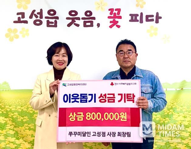 미담타임스 김교환 기자 | 고성군 고성읍는 쭈꾸미달인 고성점 최창림 사장이 11월 11일, 관내 어려운 이웃들에게 전달해달라며 ‘전국노래자랑 고성편’에서 인기상 수상 상금 80만 원을 저소득층을 위해 기탁했다.