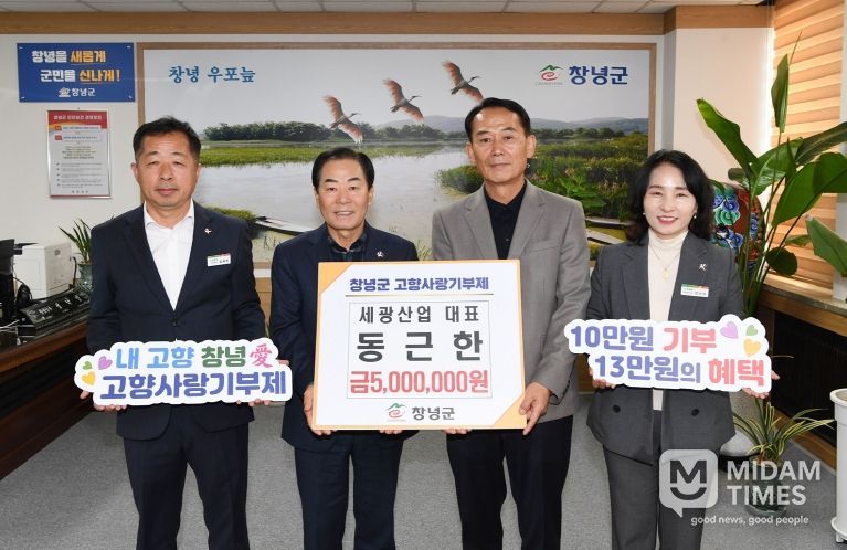미담타임스 김교환 기자 | 창녕군(군수 성낙인)은 세광산업 동근한 대표가 지난 11일 고향사랑기부제에 500만 원을 기탁했다고 밝혔다.
