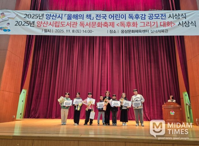 미담타임스 김교환 기자 | 양산시립도서관은 지난 8일 웅상문화체육센터 실내체육관에서 진행된 제10회 독서골든벨 식전행사에서 ‘올해의 책’ 전국 어린이 독후감 공모전 및 독후화 그리기 대회, 책 읽는 가족 시상식을 개최했다.