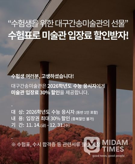미담타임스 김교환 기자 | 대구간송미술관이 14일부터 26학년도 수능 수험생을 대상으로 다양한 혜택을 제공한다. 수험표를 지참한 수험생에게는 미술관 입장료 최대 30% 할인 혜택(동반 1인 포함)이 제공되며, 이벤트 참여 시 다양한 기념품도 증정된다. 이와 함께 방송인 서경석, 영화감독 이준익이 참여하는 ‘간송예술강좌’를 개최하여 전시에 대한 다양한 의미를 되돌아보는 특별한 시간을 가진다.