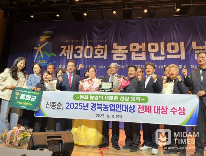 미담타임스 김준완 기자 | 봉화군은 지난 11일 경북여성가족플라자에서 열린 ‘제30회 농업인의 날’행사에서 신종순(52세)씨가 ‘2025년 경북농업인 대상’ 10개 부문 중 채소·특작분야로 전체 대상을 수상하는 영예를 안았다고 밝혔다.
