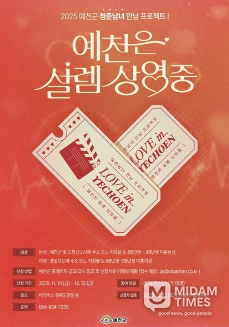 미담타임스 김준완 기자 | 예천군은 14일부터 12월 12일까지 청춘남녀 만남행사 ‘예천은, 설렘 상영 중’ 참가자를 모집한다.