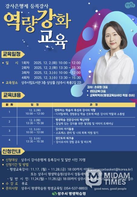 미담타임스 김준완 기자 | 상주시는 11월 17일부터 11월 28일까지‘2025년 강사은행제 등록강사 역량강화 교육’수강생 70명을 모집한다.