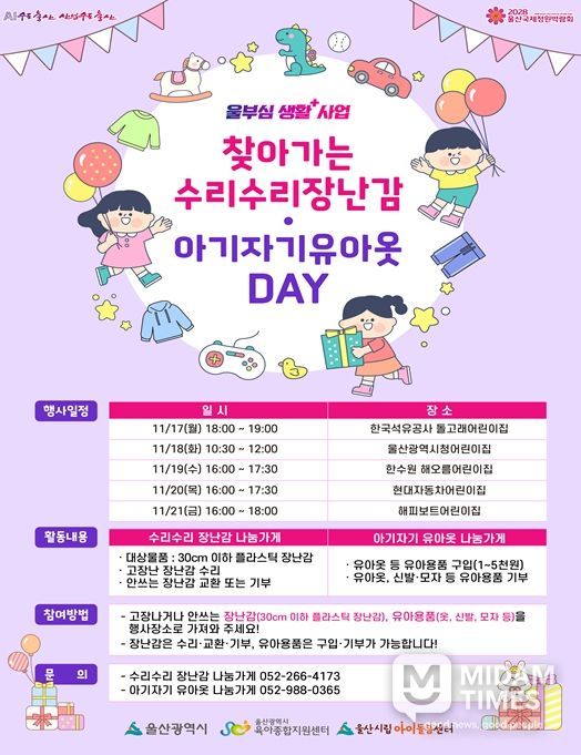미담타임스 김준완 기자 | 울산시는 오는 17일부터 21일까지 5일간 관내 주요 직장어린이집을 대상으로 ‘우리아이, 행복배달 사업(프로젝트): 찾아가는 장난감·유아옷 데이(DAY)’ 행사를 진행한다고 밝혔다.