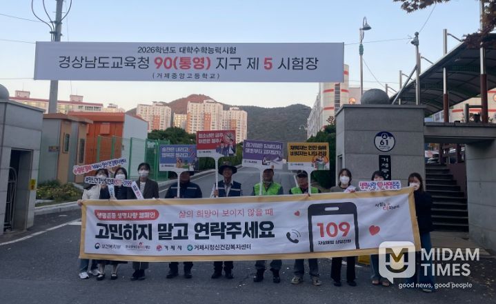 미담타임스 김교환 기자 | 거제시 정신건강복지센터는 13일 오후 5시, 거제중앙고등학교에서 2026학년도 대학수학능력시험을 치른 수험생들을 대상으로 수험생 격려 및 정신건강 캠페인을 진행했다.