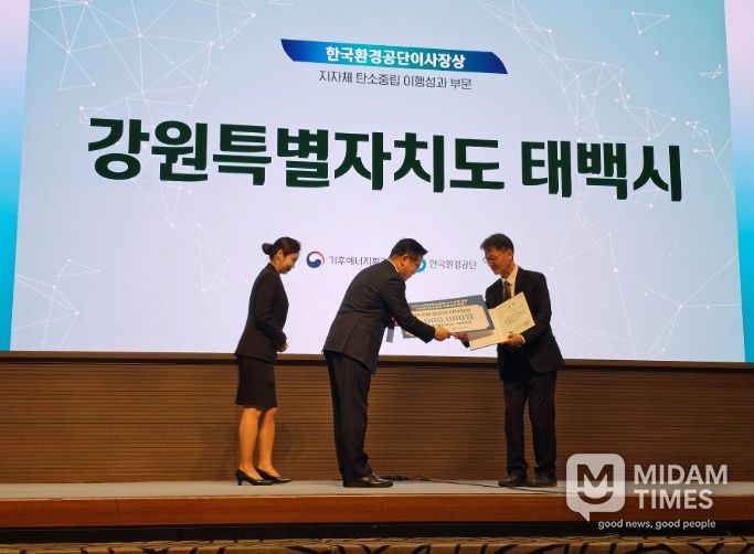 미담타임스 정인화 기자 | 태백시는 지난 17일 소노캄여수에서 열린 ‘2025 지자체 탄소중립 컨퍼런스’에서 탄소중립 이행성과 부문 우수기관으로 선정돼 한국환경공단 이사장상을 수상했다고 밝혔다.