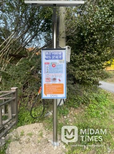 이번에 설치한 자동분사기는 태양광으로 배터리가 충천되는 친환경 방식이다.