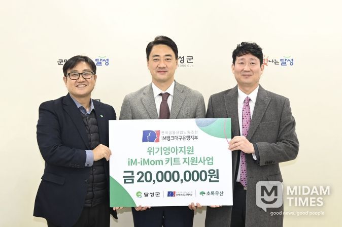 미담타임스 김교환 기자 | 대구 달성군은 18일, 전국금융산업노동조합 iM뱅크대구은행지부(위원장 백지노)가 초록우산어린이재단 대구지역본부를 통해 2천만 원 상당의 저출산키트 72세트를 기탁했다고 밝혔다.