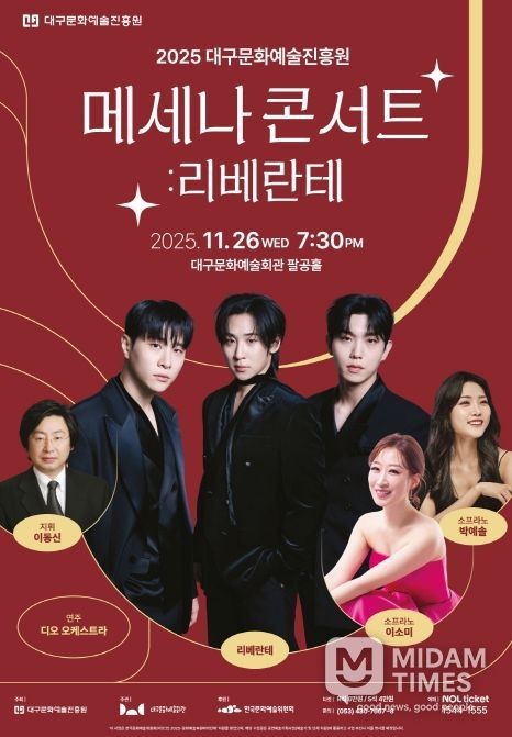미담타임스 김교환 기자 | 대구문화예술진흥원은 ‘대구 예술사랑 메세나 운동’에 보여준 시민의 사랑과 관심에 보답하고자 ‘2025 대구문화예술진흥원 메세나 콘서트 : 리베란테’를 11월 26일 오후 7시 30분 대구문화예술회관 팔공홀에서 선보인다.