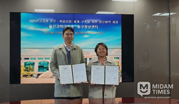 미담타임스 김준완 기자 | 울산동구청년센터(센터장 박인경)와 울산과학대학교 대학일자리플러스센터 고교생맞춤형고용서비스 사업단(사업단장 한영진)은 11월 18일 오후 1시 지역 고등학생의 조기 진로·취업 지원을 위한 업무 협약을 체결했다.