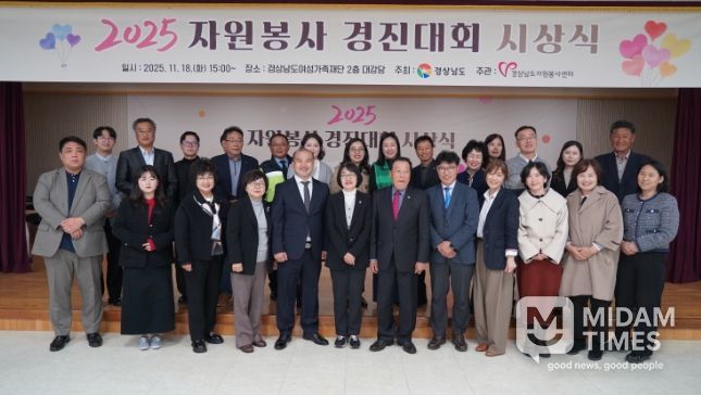 미담타임스 김교환 기자 | 경상남도는 18일 경남여성가족재단 대강당에서 ‘2025 자원봉사 경진대회 시상식’에서 지역사회 자원봉사 활성화에 기여한 29개 팀에 도지사상을 수여했다고 밝혔다.