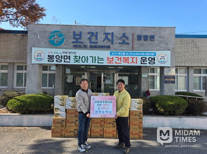 미담타임스 김준완 기자 | 의성군 봉양면은 지난 11월 18일 정두원 단장(現 봉양면 깔끄미봉사단장, 現 경북농약사 대표)이 갑작스런 한파로 어려움을 겪는 취약계층을 위해 라면 20박스와 김 20박스(약 100만원 상당)를 기탁했다고 밝혔다.