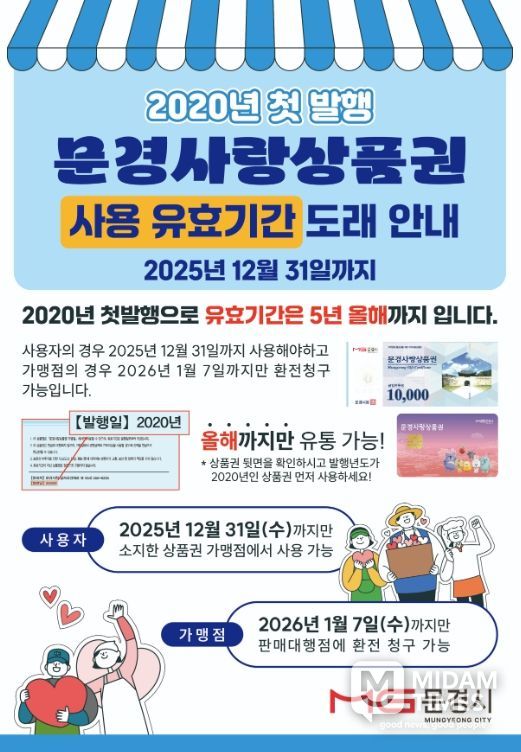미담타임스 김준완 기자 | 문경시는 2020년 발행된 문경사랑상품권 유효기간이 2025년 12월 31일 종료됨에 따라 상품권을 기한 내 사용 및 환전하도록 권했다.